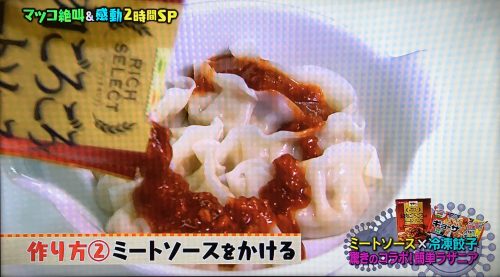 その後耐熱容器に入れた餃子の中にミートソースをかけます。