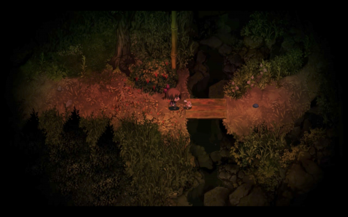 しばらく森を進むと、脆い木の板でできた橋を見つけます。