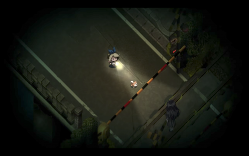 踏切までたどり着くと、線路の上には制服姿の女性が立っています。